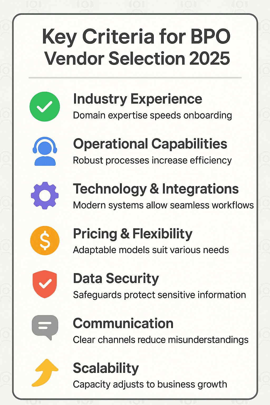 A good BPO vendor selection partner offers industry experience, robust technology, transparent pricing, and strong data security, as detailed in the Key Criteria for Choosing a BPO Vendor section.