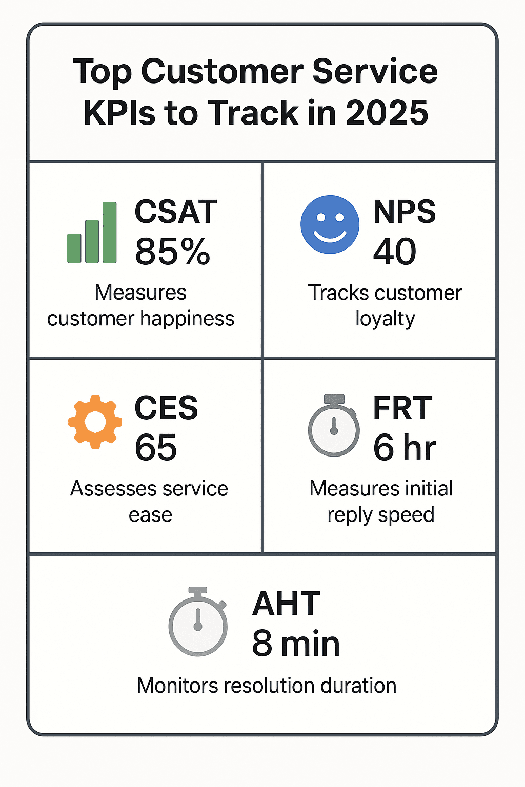 Key KPIs you should track include Customer Satisfaction Score (CSAT), Net Promoter Score (NPS), Customer Effort Score (CES), First Response Time (FRT), and Average Handle Time (AHT), among the 22 comprehensive metrics listed in this guide. Each measures different crucial aspects like overall satisfaction, loyalty, or operational efficiency. For example, consistently high FCR rates (above 70%) are known to boost customer satisfaction.